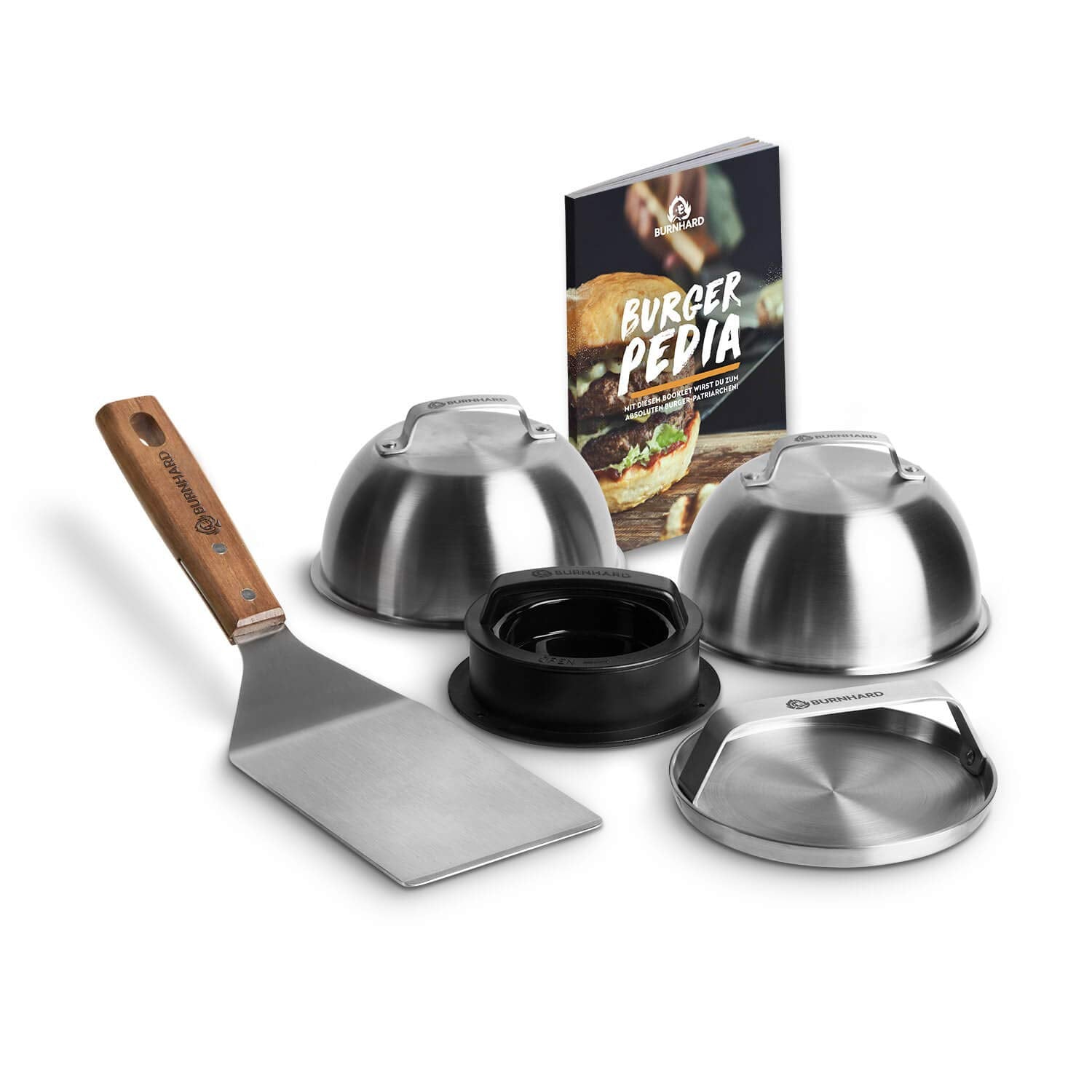 🍔 BURNHARD Burger-Set 6-tlg. – Inkl. Burgerpresse, Smasher, Wender, 2 Melting Domes & Rezeptheft aus Edelstahl